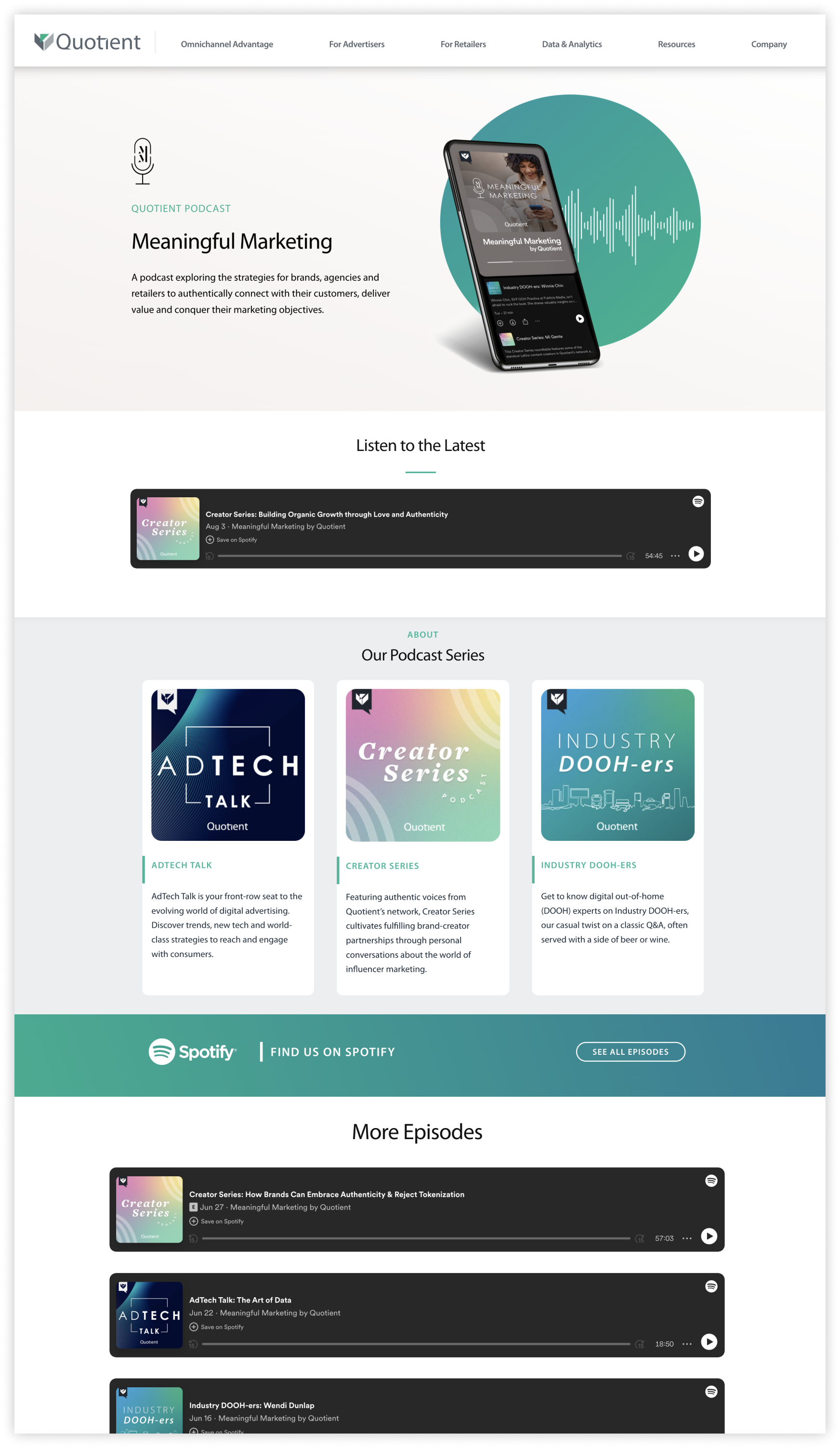 In 2021 the Quotient Messaging Project began. This was a large-scale, company-wide project that revisited our product solutions and how they were messaged to the market. The company website was restructured and reworded, but the integrity of the site design remained. However, we did take the opportunity to update areas to more closely match our collateral—by folding in more of our cream neutral and teal gradient.